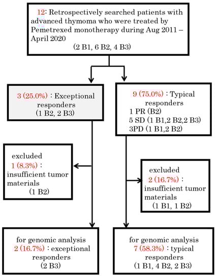 Pemetrexed is an approved multi-target anti-folate agent for the treatment of malignant pleural mesothelioma and non-small cell lung carcinoma [4]. A single-arm phase II trial [5] showed that pemetrexed is also useful for the treatment of heavily pretreated thymomas. Pemetrexed rarely produces an exceptional response in advanced thymoma, i.e., a profound and durable reduction in tumor size. In a small subset of patients with solid tumors, molecular-targeted treatments lead to extreme responses [6,7,8,9,10]. In previous studies, genomic alterations on the mammalian target of rapamycin (mTOR) pathway activation conferred exceptional response to everolimus or pazopanib [7] in various tumors [6]. Additionally, patients with lung adenocarcinoma exhibiting KRAS mutation and EGFR amplification showed an exceptional response to erlotinib therapy [8]. Another study identified very few extreme responders to anticancer therapy among patients with advanced breast cancer [9]. Moreover, patients with low-grade ovarian cancer showed an exceptional clinical response to ibrutinib when guided by organoid drug testing [10]. In these cases, certain genomic aberrations may confer exceptional sensitivity to target therapies [7,9].