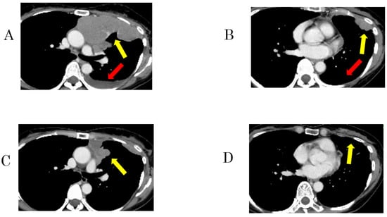 Representative imaging of a 51-year-old woman with type B3 thymoma showing an exceptional response to pemetrexed monotherapy (patient 8). (A,B) Enhanced computed tomography (CT) revealed massive pleural dissemination and pleural effusion in the left hemithorax before pemetrexed treatment. (C,D) After 7 months of pemetrexed treatment, CT showed shrinkage of the massive lesions. Images of pleural dissemination (yellow arrows) and pleural effusion (red arrows).