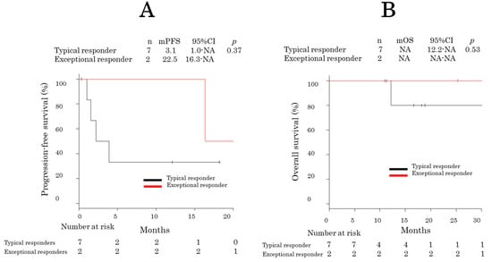 Kaplan–Meier progression-free survival curves of exceptional and typical responders. Kaplan–Meier progression-free survival (A) and overall survival (B) curves.