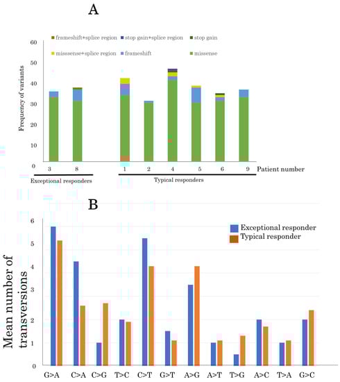 With regard to transversions, G>A substitutions were the most common mutation in all samples (50/271, 18.5%), indicating formalin fixation artifacts (Figure 4B). The second most common mutation was C>T substitution (41/271, 15.1%). The mutation pattern was similar between exceptional and typical responders. Furthermore, 17 SNVs were identified in genes that were predicted to be potentially pathogenic by at least one of the above-mentioned methods (Table 2).