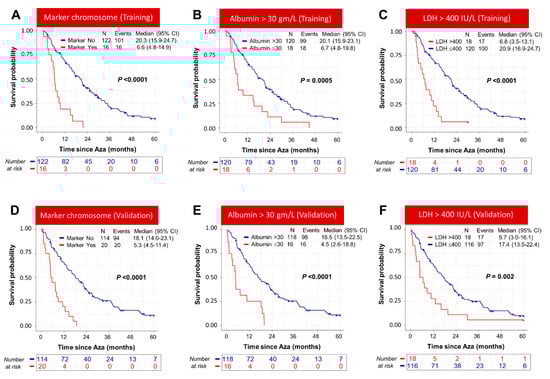 Baseline clinical parameters identified by the machine learning model influence overall survival of MDS patients treated with azacitidine. In both the training and validation cohort, marker chromosome (A,D), albumin (B,E), and LDH (C,F) predicted overall survival of azacitidine-treated patients.
