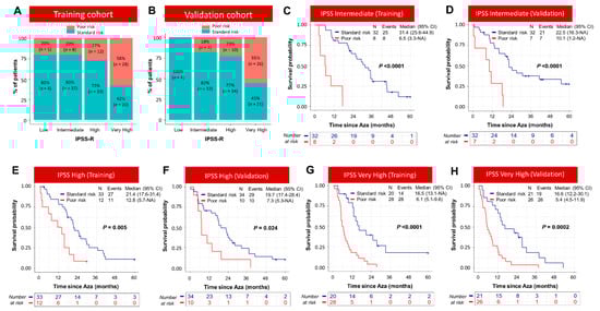 Poor-risk group, identified by the machine learning model, stratified IPSS-R groups. (A,B) Standard- and Poor-risk groups, identified by the machine learning model, are distributed across the IPSS-R risk groups. In the training and validation cohorts, Poor-risk group stratified IPSS-R Intermediate- (C,D), High- (E,F), and Very-High- (G,H) risk groups further with significant survival difference.