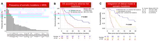 Mutation data were available for 73 patients, with the relative frequency outlined in Figure 4A. A high incidence of TP53 mutations (TP53mut) is reflective of the inclusion of t-MDS patients. The median OS of patients with TP53 wild-type (TP53wt) was significantly longer compared to TP53mut (17.40 vs. 6.91; p < 0.0001) (Supplementary Figure S4A). To identify mutations associated with poor outcome in TP53wt cases, feature selection was performed in genes mutated in >5% of cases as described in the Statistical Analysis Section. As a result, mutations in BCOR/BCORL1, SETBP1, RAS, EZH2, or DNMT3A were associated with inferior outcome (10.53 vs. 25.99; p = 0.0004) (Supplementary Figure S4B).