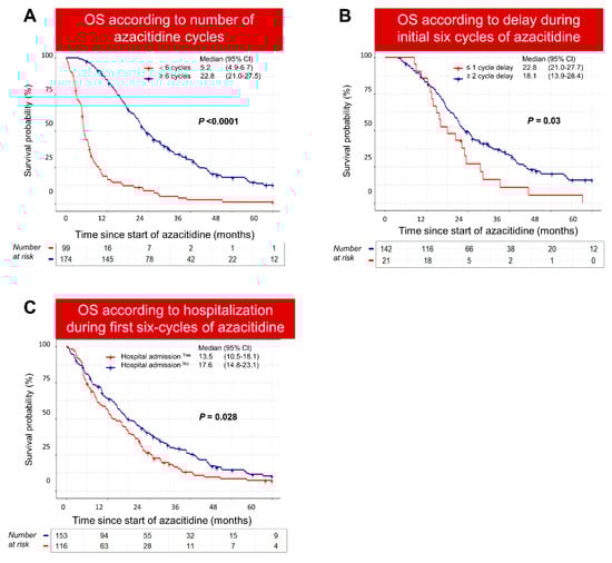 We then restricted our survival analysis to patients who completed at least six cycles of azacitidine. Notably, patients who experienced delays between the cycles on two or more occasions during the first six cycles of azacitidine had significantly inferior survival compared to cases with no delays (18.1 vs. 22.8 months; p = 0.03) (Figure 6B). Similarly, patients who required hospitalization during the first six cycles had a worse outcome compared to patients who did not require hospitalization (13.5 vs. 17.6 months; p = 0.028) (Figure 6C).