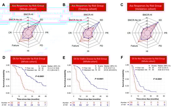 Responses following six cycles of azacytidine in Poor- and Standard-risk patients. Responses after six cycles of azacitidine in: (A) whole cohort; (B) training cohort; (C) validation cohort. The Poor-risk group is shown red color, while the Standard-risk group is shown in blue color. For each response category, the overall survival of Poor-risk patients was significantly poor compared to Standard-risk patients. (D) Responders; (E) stable disease; (F) non-responders.
