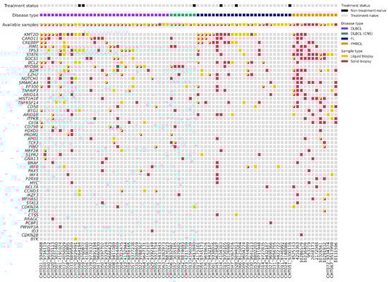 Consistently with previous studies, in FL at diagnosis, we observed the following most recurrently mutated genes (both in tissue and plasma samples): KMT2D, CREBBP, BCL2, and EZH2 [,]. Also, in agreement with previous literature, we found that CARD11 and KMT2D were the most frequently mutated genes in the GC phenotype in DLBCL; and MYD88, PIM1, and CD79B were the most frequently mutated genes in the non-GC phenotype [,]. Additionally, we confirmed the higher frequency of MYD88 mutation in 80% (mainly in the hotspot L265P) of our PCNSL tissue and plasma samples []. Finally, consistent with recent reports, we confirmed a molecular signature in PMBCL that differed from the ones of other DLBCLs and was characterized by the presence of STAT1 and/or SOCS1 mutations in 65–85% of the cases [,].