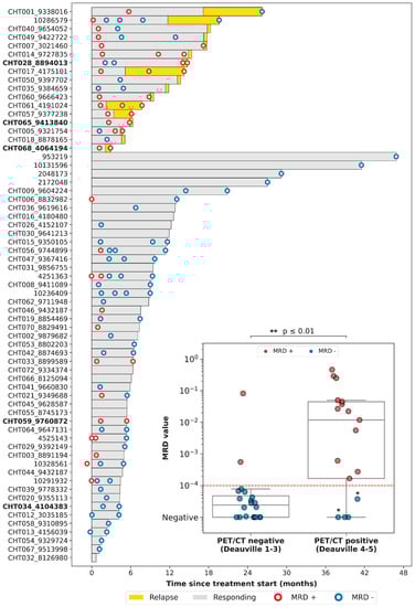Swimmer plot of the different follow-up time-points. We present a boxplot Internal panel with correlation of LiqBio–MRD and PET/CT. Red dotted lines represent the sensitivity LiqBio–MRD test (2 × 10−4). Two data points in blue (*), despite PET positivity, were LiqBio–MRD negative and did not progress. In bold, non-treatment-naïve patients.
