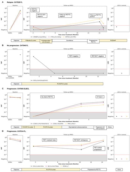 Four representative cases of different scenarios are shown in Figure 4. An example of disease remission with concordant results of PET/CT and LiqBio–MRD can be observed in patients CHT028 (Figure 4A) and CHT049 (Figure 4B), with subsequent relapse in patient CHT028. In patient CHT005 (Figure 4C) no PET/CT interim was available because of the COVID-19 pandemic emergency. After a negative post-2-cycle-therapy LiqBio–MRD, a third sample at EOT tested positive, predicting the relapse that occurred three weeks later. In patient CHT014 (Figure 4D), the EOT PET/CT was ambiguous: a new adenopathy was observed in a low SUVmax, while LiqBio–MRD was persistently positive. A control PET/CT a month later confirmed progression.