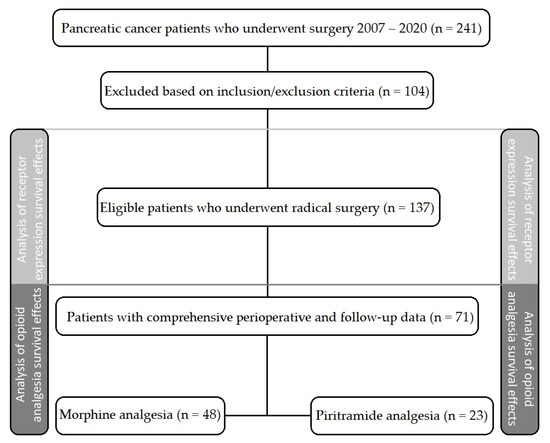 Data and samples representing 241 patients who underwent pancreatic cancer surgery at the University Hospital Olomouc and University Hospital Brno were biobanked between 2007 and 2020 and evaluated (Figure 1). Based on the inclusion and exclusion criteria (Table 1), the opioid receptor expression was analyzed in 137 tumor tissue samples. The comprehensive perioperative and follow-up data were mined in seventy-one patients, including the cause of death. Total doses of morphine and piritramide administered for postoperative analgesia were obtained, and piritramide doses were converted to morphine equivalents according to the equation 1 mg piritramide = 0.75 mg morphine [34]. Patients received either morphine or piritramide. No patients received both morphine and piritramide (Table 2). The quantitative real-time polymerase chain reaction was used to analyze the expression of the following opioid and cannabinoid receptors in tumor tissue samples: OGFR, OPRM, OPRD, kappa opioid receptor (OPRK), lambda opioid receptor (OPRL), CB1, and CB2.