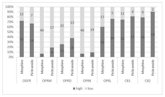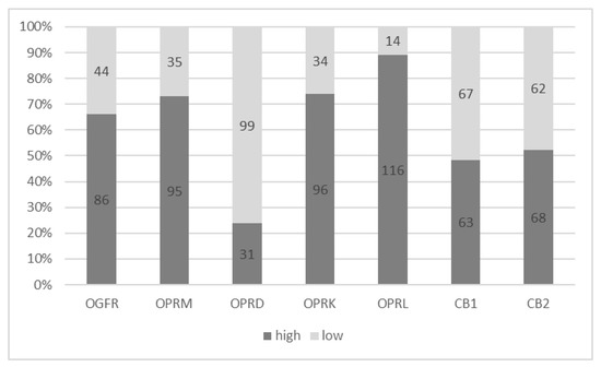 In total, 7 of the 137 patients initially included in the study had inconclusive receptor gene expression data, leaving 130 eligible for inclusion in the receptor gene expression analysis (Figure 1). Receptor gene expressions were categorized using estimated cut-off values (see Methods). All receptors were highly expressed in pancreatic tumor tissues except the OPRD (Figure 2).