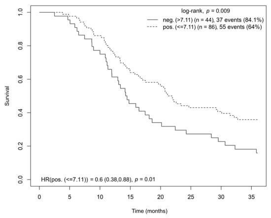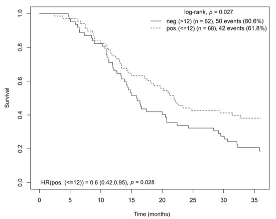 In patients with high CB2 receptor gene expression in tumor tissue, a significantly longer OS was found (log-rank test, p = 0.027; HR = 0.6, p = 0.028) (Figure 3). The multivariate Cox model analysis stratified by disease stage and adjusted for age and sex confirmed the findings (HR = 0.650; CI = (0.420–1.006); p = 0.053).