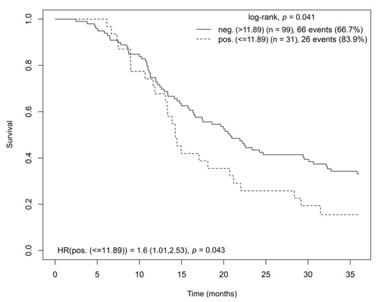 Patients with high OGFR receptor gene expression in tumor tissue had significantly longer OS (log-rank test, p = 0.009; HR = 0.631, p = 0.01) (Figure 4). This finding was confirmed by a multivariate Cox model analysis stratified by disease stage and adjusted for age and sex (HR = 0.588; CI = (0.372–0.927); p = 0.022).