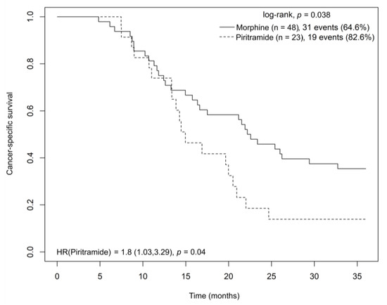 Patients receiving morphine analgesia had a significantly longer cancer-specific survival (CSS) than those receiving piritramide analgesia (22.4 vs. 15 months) according to a log-rank test (HR = 1.8, p = 0.04) (Figure 7). In a multivariate Cox model analysis stratified by disease stage and adjusted for age and sex, piritramide had a negative effect on CSS (HR = 2.904; CI = 1.485–5.679; p = 0.002) when compared to morphine.