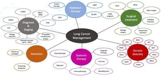 Lung cancer is a heterogeneous disease with a complex and multimodal management. Lung cancer is a highly heterogeneous disease including numerous subtypes. Recent advances in techniques have significantly expanded the treatment landscape, resulting in both increased complexity and the potential for personalized medicine, offering patients the prospect of more effective and precise interventions based on their unique tumor profiles. VATS: video-assisted thoracoscopic surgery; RATS: robotic-assisted thoracoscopic surgery; r-EBUS: radial endobronchial ultrasound; EBUS-TBNA: endobronchial ultrasound-guided transbronchial needle aspiration; ENB: Electromagnetic navigation bronchoscopy; CTC: Circulating tumor cells; IGRT: Image guided radiation therapy; SBRT: Stereotactic body radiation therapy; 3D CRT: 3-Dimensional conformal radiation therapy; ERAS: enhanced recovery after surgery.