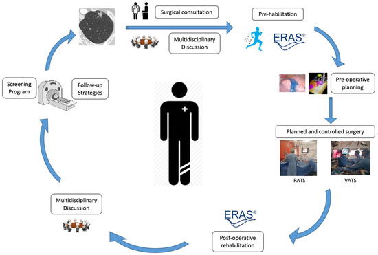 Patient Pathway for Personalized Surgical Management of Early-Stage Lung Cancer in 2023. The patient, initially screened or monitored for a previous cancer, is diagnosed with early-stage lung cancer based on a recent CT scan. In order to determine the best course of treatment, the patient’s case is presented at a multidisciplinary meeting, where a team of specialists collectively discusses and develops a personalized treatment plan. The patient has a consultation with a thoracic surgeon, who explains the personalized surgical approach for their case (3D reconstruction, sublobar resection, and preoperative rehabilitation). The surgery is performed using minimally invasive techniques. The patient is included in an ERAS program. Based on the pTNM staging system, a decision is made regarding the need for further surveillance imaging.