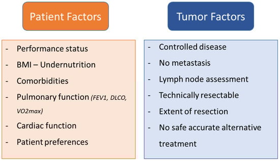 Integrating the patient in a multimodal approach through “precision surgery” is of utmost importance in the field of thoracic surgery. Lung surgery is not a binary procedure categorized solely as resectable or non-resectable [75]. It is crucial to move beyond indications based solely on respiratory function and to consider various factors (tumor characteristics: size, appearance, localization; patient comorbidities and age, etc.). Adopting a comprehensive approach allows for a more personalized treatment plan [76,77].