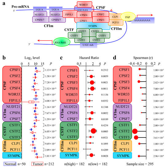 The effects of 3′-end formation complex components on HCC. (a) Illustration of the 3′-end formation complex. Scissor represents the cleavage site of CPSF. The arrow pointing right represents the direction of polyadenylation, while the arrow pointing left represents the direction of transcription. (b) The expression differences of each 3′-end formation complex component in HCC and PT tissues are compared using a box plot. The box plot visually represents the maximum and minimum values (shown at the end of the whiskers), the interquartile range (shown as the box), and the median (the line dividing the box into two parts). p-values are listed on the right. (c) Lollipop plot depicts the impact of each 3′-end formation complex component on the hazard ratio (HR) of HCC patients. The width of the line represents the 95% confidence intervals of each study, the dot on each line represents the HR of that study, and the size of the dot represents the “weight” of the study. p-values are listed on the right. HR is an index to judge whether the expression of a certain gene is a favorable or unfavorable factor for a patient’s survival. When the HR < 1 and p < 0.05, it indicates that high expression of the gene can lower the risk of death and improve patient survival. Conversely, when the HR > 1 and p < 0.05, it suggests that high expression of the gene increases the risk of death and reduces patient survival. (d) The correlation of each 3′-end formation complex component with the total circRNA level is analyzed by Spearman’s correlation test; the p-values are listed on the right.