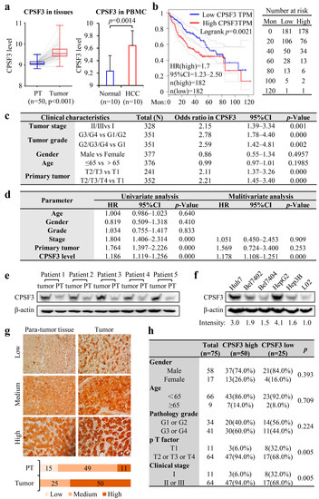 All these data indicate that high expression of CPSF3 predicts poor prognosis in HCC patients, which suggests that CPSF3 may be involved in the tumorigenesis and metastasis of HCC.