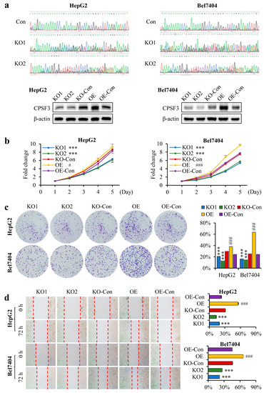 CPSF3 promoted the proliferation and migration of HCC cells. (a) Genome sequencing analysis of CPSF3 in HepG2 and Bel7404 KO cell lines reveals nested peaks, suggesting sequence disorder. Different colors represent different bases: adenine (green), guanine (black), cytosine (blue), thymine (red). Western blot results indicate that CPSF3 protein expression is decreased in the KO cell lines of HepG2 and Bel7404 and increases in the OE cell lines. (b) The CCK8 assay results (n = 5) reveal increased cell growth in CPSF3 OE cells and decreased growth in CPSF3 KO cells compared to their respective controls. (c) The colony formation assay demonstrates that CPSF3-OE cells form more colonies than pcDNA3 control cells, while CPSF3-KO cells form fewer colonies than lentiCRISPR v2 control cells. The culture dishes are imaged using a regular camera without magnification. The left panel shows the representative images, and the right panel shows the statistical analysis (n = 3). (d) The cell scratch assay results show that CPSF3-OE cells had faster healing rates, while CPSF3-KO cells had slower healing rates. The culture dishes were imaged using an optical microscope equipped with a 10× eyepiece and a 10× objective lens. The red dashed lines delineate the forefront of cellular migration. The left panel shows the representative images, and the right panel shows the statistical analysis (n = 3). In this figure, KO1 and KO2 indicate the knockout cells, which are compared to lentiCRISPR v2 vector-transfected cells; *** p < 0.001. OE denotes the overexpressing cells, which are compared to the pcDNA3 vector-transfected cells; # p < 0.05, ### p < 0.001. Error bars indicate standard deviations. The uncropped blots are shown in File S9.