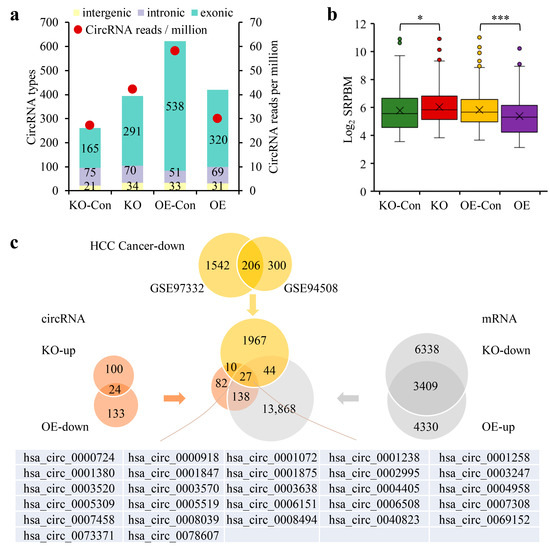 The real effect of CPSF3 on circRNA expression in HCC cells was tested by analyzing the total RNA fractions obtained from CPSF3-KO HepG2 cells, CPSF3-OE Bel7404 cells, and negative control cells using high-throughput sequencing (Supplementary Files S7 and S8). The data obtained showed that CPSF3-KO cells had more types and a greater number of circRNAs compared to control cells, while CPSF3-OE cells had fewer types and a smaller number of circRNAs. The circRNAs affected by CPSF3 were mainly exonic, while intergenic and intronic circRNAs remained unchanged in all four cell lines (Figure 5a). The average level of each circRNA (unit: log2 SRPBM) increased from 5.8 ± 1.5 in control cells to 6.0 ± 0.19 in CPSF3-KO cells (p = 0.015), and conversely, decreased from 5.8 ± 1.3 in control cells to 5.4 ± 1.4 in CPSF3-OE cells (p = 3.1 × 10−7) (Figure 5b). Based on the obtained sequence data, it can be concluded that CPSF3 globally reduced the expression of circRNAs, which was consistent with the fluorescent reporter results.