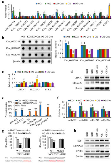 We also tested for changes in the downstream pathways of circRNAs. Prior research has suggested that reducing circRNAs chronically results in the destabilization of the miRNAs bound to them [34]. CircRNAs act as miRNA sponges and protect them from exonuclease cleavage [35]. Universal downregulation of miRNAs has been observed in HCC [36]. As such, we selected four target miRNAs that were significantly downregulated in HCC for further study. Of these, miR-622 and miR-1247 are the targets of hsa_circ_0001380, while miR-188 and miR-1294 are the targets of hsa_circ_0078607 (Appendix A, Figure A2a,b). To confirm the binding between circRNAs and their target miRNAs, biotinylated circRNA probes were used to precipitate circRNAs and their target miRNAs. The results indicated that miR-622 and miR-1247 co-precipitated with hsa_circ_0001380, while miR-188 and miR-1294 co-precipitated with hsa_circ_0078607 in HepG2 cells (Figure 6e). The expression levels of these four miRNAs in cells with different CPSF3 levels were then detected by real-time PCR to check the influence of CPSF3 on downstream miRNAs. The data revealed that all four miRNAs were upregulated in CPSF3 KO cells, whereas they were downregulated in CPSF3-OE cells (Figure 6f), confirming that CPSF3-mediated circRNA reduction decreased their miRNA levels. As a tumor suppressor, miR-622 directly targets E2F1 [37]. A high E2F1 level is a risk factor for HCC [38]. MiR-188 has been found to target NCAPG2 directly, while increased NCAPG2 and decreased miR-188 levels have been associated with HCC progression and poor prognosis [39]. Bioinformatic analysis from the online tool TargetScan showed that the seed sequence of miR-622 bound with the 3′-UTR of E2F1, and the seed sequence of miR-188 bound with the 3′-UTR of NCAPG2 (Appendix A, Figure A2c). Data obtained from Gene Expression Profiling Interactive Analysis (GEPIA) demonstrated that these two target genes were upregulated in HCC, and their high levels indicated a shorter OS of HCC patients (Appendix A, Figure A2d,e). The silencing effect of miRNAs on their target genes was confirmed by the luciferase assay, as the hFluc/hRluc ratio decreased with the increase of miRNA-mimics in the luciferase reporter with the 3′-UTR of target genes, but no changes were detected in the luciferase reporter containing a mutant 3′-UTR (Figure 6g). To explore the effect of CPSF3 on these miRNA-targeted genes, the protein levels of E2F1 and NCAPG2 were detected by western blot. The results showed that both E2F1 and NCAPG2 were decreased in CPSF3-KO cells and increased in CPSF3-OE cells (Figure 6h). All of these findings demonstrated that CPSF3 reduced circRNA levels and disrupted miRNA mediated gene silencing in HCC cells.