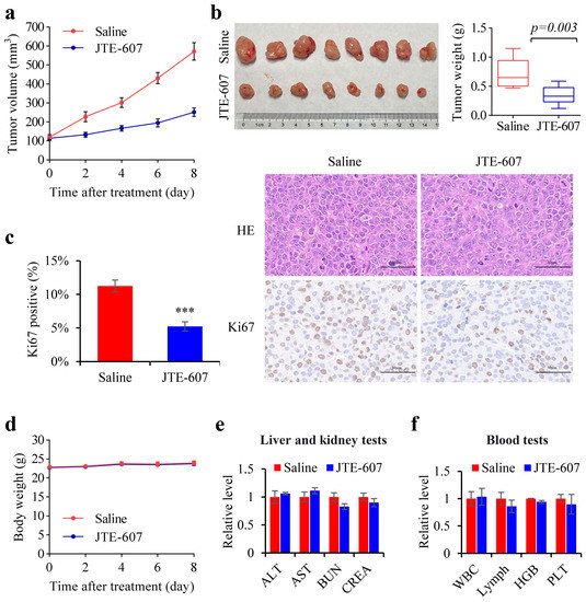 Efficacy and safety of JTE-607 in tumor-bearing nude mice. (a) Tumor growth curves of nude mice during JTE-607 administration. (b) Tumors were photographed and weighed after excision. (c) Above is the hematoxylin and eosin staining and below is the immunohistochemical staining results for Ki67. Scale bar, 50 µm. (d) Changes in the body weight of nude mice during JTE-607 treatment. (e) Serum levels of ALT, AST, BUN, and CREA in tumor-bearing nude mice were measured two days after the last treatment. (f) Blood cell parameters (WBC, lymph, HCB, and PLT) in tumor-bearing nude mice two days after the last treatment. Error bars represent standard deviations (n = 8). *** p < 0.001.