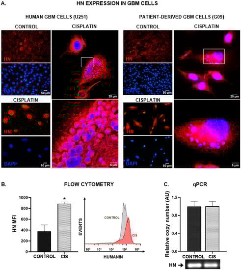 We first assessed HN expression by immunofluorescence in the human GBM cell line U251-MG, as well as in cell cultures derived from a GBM biopsy (wtIDH glioma, G09) [21] incubated with or without cisplatin. HN expression was detected in all cells studied, but it was visibly increased when they were treated with chemotherapy (Figure 1A). Furthermore, the intracellular distribution of HN seemed to change in response to chemotherapy. We also assessed the effect of cisplatin on HN expression by flow cytometry in U251-MG human GBM cells. We observed that cisplatin induced a significant increase in HN protein levels (Figure 1B). However, when we explored the expression of HN at the transcriptional level by qPCR (Figure 1C and Figure S1), we did not find significant differences. These findings suggest the possibility that the translation of HN mRNA to protein had already occurred before the incubation time analyzed, when striking changes were detected in HN protein levels.