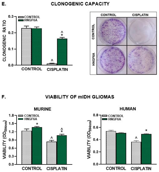 HN analogue facilitates chemoresistance in human GBM cells. (A–E) U251-MG cells were incubated with different concentrations (A) or 1.25 μM HNGF6A (B–E) for 2 h before cisplatin (2 μM) was added for additional 72 h (n = six replicates/condition). Viability was assessed by the MTT assay (A,B), proliferation was evaluated by BrdU incorporation (ELISA) (C) and cell death was determined by the propidium iodide exclusion method (D). Representative dot plots are shown for each condition. (E) Clonogenic capacity was evaluated 10 days after seeding the cells that were alive after cisplatin treatment (n = three replicates/condition). The panels on the right show representative images of the colonies formed in each experimental condition at the end of the clonogenic assay. (F) mIDH glioma neurospheres derived from genetically engineered mouse tumors and patient-derived biopsies cells (G01) were incubated with HNGF6A (1.25 μM) for 2 h before adding cisplatin (5 μM) for 72 h. Viability was measured by MTT assay. * p < 0.05 vs. respective controls without HNGF6A; ^ p < 0.05 vs. respective control without cisplatin, ANOVA followed by Tukey’s test.