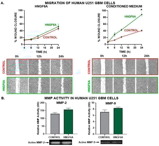 Effect of HNGF6A on GBM cell migration and angiogenic capacity. (A) GBM U251-MG cells were seeded to confluence and incubated with HNGF6A (1.25 μM, left panels) or with conditioned media from HNGF6A-treated cells (right panels). The monolayer was scratched and the cell-free area was measured at different time points. * p < 0.05 (nonlinear regression analysis). Representative images of the scratch areas are shown. (B) SDS-PAGE gelatin zymography of conditioned media from human GBM U251-MG cells incubated in the presence of HNGF6A (1.25 μM) for 48 h. The bands were analyzed by densitometry with the ImageJ software (Version: 1.53k) and the zymographic activity was expressed as a percentage in relation to a standard internal sample that is saturated at a density of 50%. * p < 0.05 Student’s t-test (C) EA.hy926 endothelial cells were seeded to confluence and incubated directly with HNGF6A (1.25 µM) or using conditioned media from HNGF6A-treated U251-MG cells. A scratch test was performed and the cell-free area was measured at different time points. * p < 0.05 (nonlinear regression analysis). (D) EA.hy926 endothelial cells were incubated with HNGF6A (1.25 µM) or with conditioned media from HNGF6A-treated U251-MG cells for 48 h and proliferation was determined by BrdU incorporation (ELISA) * p < 0.05 Student’s t-test.