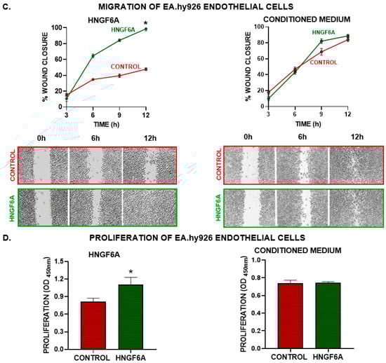 Since angiogenesis and endothelial proliferation are also hallmark features of GBM, we evaluated the effect of HNGF6A in EA.hy926 human endothelial cells (Figure 3C,D). We assessed the migration of EA.hy926 endothelial cells by the wound closure assay and their proliferation by BrdU incorporation after incubation with HNGF6A or with conditioned media from HNGF6A-treated GBM cells. While HNGF6A accelerated the migration and boosted the proliferation of EA.hy926 endothelial cells, conditioned media from GBM cells treated with this peptide did not affect these characteristics in endothelial cells (Figure 3D).