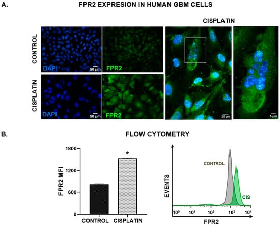 HN and FPR2 expression was evaluated by fluorescent microscopy, as previously described [16]. Briefly, 70,000 GBM cells were seeded on coverslips in 24-well plates and incubated with or without cisplatin (2 µM) for 48 h. Then, cells were fixed with 4% PFA and subjected to antigen retrieval with citrate buffer (pH 6) in a microwave at 350 W for 5 min. Cells were permeabilized with a solution of TBS–0.5% Triton–0.1% sodium azide. To block non-specific binding sites, a solution of TBS–0.2% Triton–0.1% sodium azide and 10% goat serum was used for 1 h. Subsequently, cells were incubated with an anti-HN (1:100, Novus Biol cat# NB100-56877SS) or anti-FPR2 (1:100, Novus Biol cat# NLS1878SS) antibody in 0.2% TBS–Triton–0.1% sodium azide and 1% goat serum overnight. The next day, cells were washed and incubated with an anti-rabbit IgG antibody (1:200, Vector Laboratories Inc., Newark, CA, USA) to HN and Alexa Fluor 488 conjugated anti-rabbit antibody (1:200, Invitrogen cat# A-11070) to FPR2. Finally, cells were stained with DAPI (4′,6-diamidino-2-phenylindole) used at a concentration of 5 µg/mL and mounted on slides with Vectashield (Vector Laboratories, Inc., Newark, CA, USA). Visualization of cells was performed using a fluorescent light microscope (Axiophot; Carl Zeiss, Jena, Germany). Negative controls were created by incubating cells without the primary antibody.