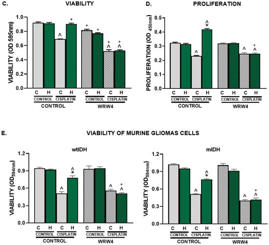 FPR2 mediates the cytoprotective effect of HN in GBM cells. Human GBM U251-MG cells were incubated with 2 µM cisplatin for 48 h. FPR2 expression was assessed by immunofluorescence (A) and flow cytometry (B). (A) Images show FPR2 immunostaining (green), and DAPI-stained nuclei (blue). A representative magnified image of cisplatin-treated cells using confocal microscopy is shown. The white box indicates the area magnified in the right panel (B) Mean fluorescence intensity (MFI) of FPR2 in human U251-MG GBM cells (n = three replicates/condition). * p < 0.05 Student’s t test. (C–E) U251-MG GBM cells as well as wtIDH and mIDH murine neurospheres were incubated with 10 µM WRW4 (FPR2 antagonist), in the presence of HNGF6A and cisplatin for 72 h. (n = six replicates/condition). Viability was determined by MTT assay (C,E) and proliferation was assessed by BrdU incorporation (ELISA, (D)). * p < 0.05 vs. respective control without HNGF6A; ^ p < 0.05 vs. respective control without cisplatin. + p < 0.05 vs. respective control without WRW4. ANOVA followed by Tukey’s test. (C: Control, H: HNGF6A).