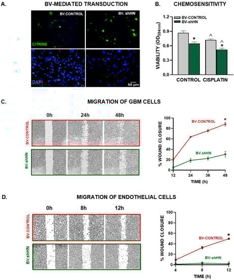 BV-mediated silencing of HN in GBM cells. Murine GBM cells (GL26) were transduced with BV.Control or BV.shHN (750 pfu/cell) for 48 h. (A) Expression of the reporter gene (green) was assessed using fluorescent microscopy. (B) Transduced cells were incubated with cisplatin (5 μM) for 72 h and viability was assessed by MTT assay. * p < 0.05 vs. respective BV.Control, ^ p < 0.05 vs. respective control without cisplatin. ANOVA followed by Tukey’s test. (C) Murine GBM cells (GL26) were seeded until reaching confluence, transduced with BV.shHN or BV.Control (750 pfu/cells) and migration was evaluated at different time points using the wound assay. * p < 0.05 vs. BV.Control (nonlinear regression analysis). (D) EA.hy926 endothelial cells were seeded to confluence and incubated with conditioned medium from GBM cells transduced with BV-shHN. A wound assay was performed and the cell-free area was measured at different time points. * p < 0.05 vs. BV.Control (nonlinear regression analysis).