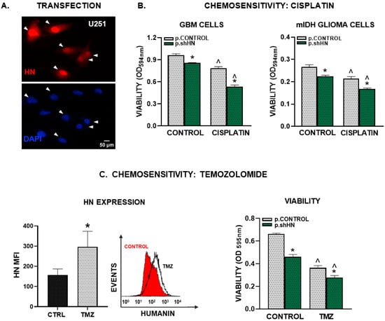 The shRNA comprising the hHN RNA sequence (shRNA hHN: CCCGTGAAGAGGCGGGCATAAAAGTTCTCTTTATGCCCGCCTCTTCACGGGTTTTTT) was synthesized and fused with the U6 promoter and cloned into a bicistronic pUC57 vector (p. shHN). To detect transfected cells, the construct contains the coding sequence for the fluorescent reporter protein dTomato under the control of the immediate early (IE) promoter of the cytomegalovirus (CMV). GBM cells were transfected with 1 μg of p. shHN or control plasmid DNA using Lipofectamine 2000 and incubated for 48 h. To evaluate transfection efficiency, cells were washed with PBS, fixed with 4% PFA for 10 min, stained with DAPI, and mounted with Vectabom for subsequent visualization through fluorescence microscopy. To evaluate the efficiency of transfection or to evaluate HN expression, cells were incubated with cisplatin (2 µM) for 72 h, and cell viability was measured using MTT.
