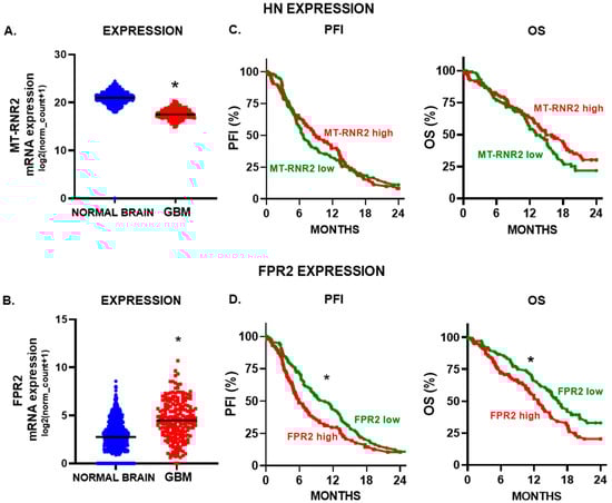HN and FPR2 expression and prognosis of GBM patients. The mRNA expression of humanin (A) (MT-RNR2) and (B) FPR2 was evaluated using transcriptomic data of normal brain tissue (GTEx, n = 1141) and GBM biopsies (TCGA Pan-Cancer database, n = 207). *, p < 0.05; Mann-Whitney U test. Kaplan–Meier curves were created using UCSC Xena database and TCGA LGG-GBM cohorts. Progression-free-interval (PFI) and overall survival (OS) curves of GBM patients that were stratified according to (C) HN (MT-RNR2) and (D) FPR2 mRNA expression levels using the median of expression as a cut-off point. * p < 0.05, Log rank (Mantel–Cox) test.