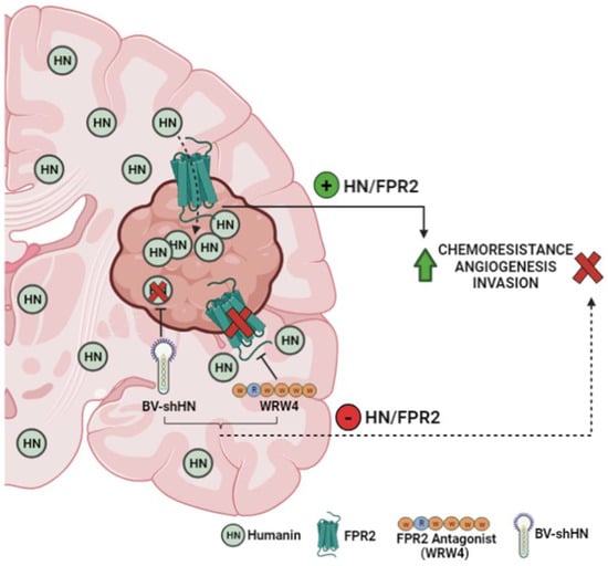 Taking into account that the response of GBM to chemotherapy is very poor, several therapeutic strategies have been proposed to improve treatment results. Among them is the silencing of genes through viral vectors, which have been shown to efficiently deliver genes that block the expression of tumor-promoting genes [45,46]. In this sense, baculoviruses (BVs) represent useful tools to be used as gene therapy vectors. These vectors are relatively simple to produce and purify at high titers and have a broad cloning capacity, allowing the transfer of multiple transgenes and regulatory elements simultaneously [47,48]. Furthermore, since they are natural insect pathogens, patients do not possess pre-existing immunity against these vectors [47]. We previously reported that the local administration of BVs inhibits tumor growth in experimental rat prolactinomas [49]. Also, we have recently demonstrated that BVs efficiently transduce glioma cells and astrocytes in vitro and in vivo without causing neurotoxicity [24]. The silencing of HN transcriptional expression via BV.shHN boosted the cytotoxic response of glioma cells with heterogeneous genetic backgrounds, i.e., wtIDH and mIDH glioma cells. In addition, HN silencing impaired GBM cell migratory and proangiogenic properties, suggesting that the local administration of these vectors could constitute an interesting strategy to aid in the treatment of this aggressive tumor. Considering that HN could reach the tumor from neighboring cells, such as astrocytes [50], or even arrive to the tumor from the general circulation, local blockade of FPR2 using gene therapy vectors encoding for specific shRNA, or for the peptidic antagonist WRW4, could be useful strategies to inhibit this pathway in GBM (Figure 8).