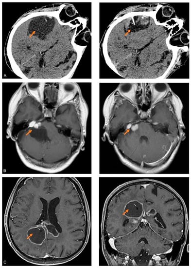 CT and MRI images of the cystic brain tumors studied: (A) Axial CT image of the SM obtained before (left) and after partial aspiration (right) of fluid in the cyst (orange arrows). In the right image, the needle (white arrow) used for the aspiration of the fluid is visible in the shrunken cystic cavity. (B) Axial MRI T1 weighed images with contrast, obtained before (left) and after (right) partial aspiration of fluid in the cyst (orange arrows) associated with the right-sided CS. (C) Axial and coronal MRI T1 weighed images with contrast of CG after the implantation of a catheter (white arrows) inside the largest cyst (orange arrows).