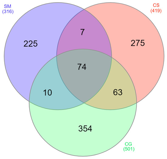Venn diagram of the distribution among the different tumors of the identified proteins. SM: blue, CS: red and CG: green. Numbers in parentheses refer to the total number of proteins identified in each tumor.
