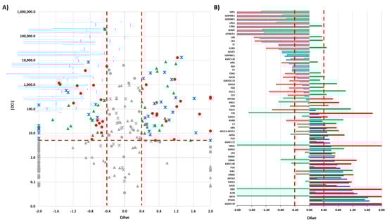 (A) Boxplot of DAve vs. |DCI| calculated for all 102 HR proteins in the comparisons of SM vs. CS; SM vs. CG; CS vs. CG. Red circles: SM vs. CS; blue crosses: SM vs. CG; green triangles: CS vs. CG. In grey: discarded proteins according to DAve and DCI filters. (B) DAve vs. gene name of 54 DEPs. Red: SM vs. CS; Blue: SM vs. CG; Green: CS vs. CG; Filled (positive) and Empty (negative): up- and downregulated, respectively, in the first condition.