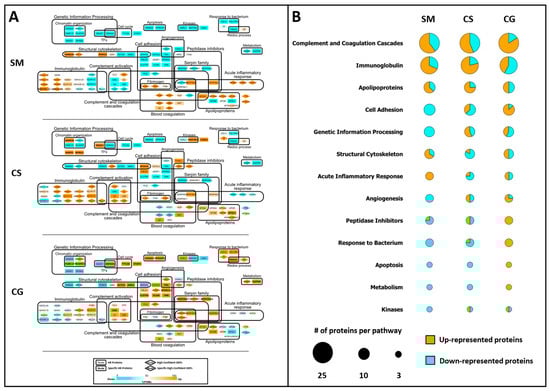 We also submitted the HR proteins to a systems biology analysis with the aim of identifying functional pathways that both describe the complexity of biofluids and, potentially, highlight some peculiarities in the composition of each cystic fluid. For each tumor histotype, a PPI network was constructed (Figure 4A). Each protein is represented through a node containing the protein gene name; DEPs are indicated by a rhombus node, while tumor-specific HR proteins are highlighted with the gene name in bold. HR proteins were grouped into different functional pathways, according to STRING Cytoscape’s APP and BINGO 2.44 functional annotations. A color graduation scale, from light blue to orange, is attributed to each node according to the relative abundance of the protein in tumors: the highest value of SpC associated to the same protein in SM, CS and CG is set to 100 (orange node), while the other SpC values are expressed as a relative percentage and, consequently, represented as the corresponding colors in the figure’s legend.