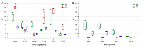 Multiple comparison graphs of the spectral count (SpC) levels of selected proteins present in the cystic fluid of various tumors. (A) Gamma immunoglobulin heavy and light chains from SM: secretory meningioma; CS: cystic schwannoma; CG: cystic high-grade glioma. Boxes represent values from the lower to the upper quartiles; vertical lines connect minimum and maximum values; experimental points derived from cystic fluid of SM are represented as green circles, red triangles are those derived from CS, and blue rhombuses are those derived from CG, asterisk indicates immunoglobulin values in CS significantly different from the other tumors (p < 0.05 ANOVA). IGHG1: immunoglobulin heavy constant gamma 1; IGHG2: immunoglobulin heavy constant gamma 2; IGHG3: immunoglobulin heavy constant gamma 3; IGHG4: immunoglobulin heavy constant gamma 4; IGKC: immunoglobulin kappa constant; IGLC2: immunoglobulin lambda constant 2. (B) Levels of hemoglobins, a marker of blood contamination. Boxes, lines and symbols are as in (A). HBA1-2: hemoglobin subunit alpha; HBB: hemoglobin subunit beta; HBD: hemoglobin subunit delta; HBG1: hemoglobin subunit gamma-1.