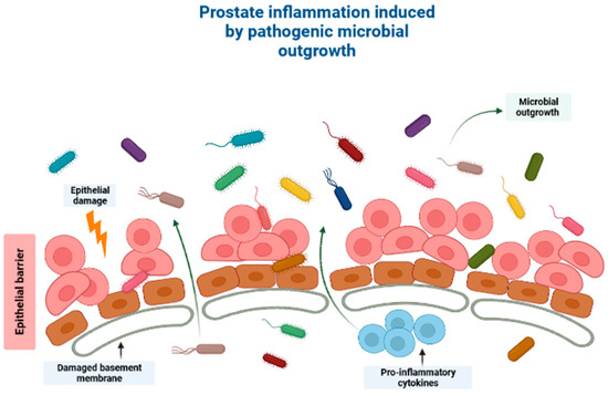 A schematic diagram showing how the human microbiome induces cancer pathogenesis, specifically through induction of prostatic inflammation. Outgrowth of pathogenic microorganisms might take place in the luminal portion of the prostate ducts under pathological conditions. This outgrowth might be due to one of several reasons, including introduction of the microorganisms into the prostate organ through urine reflux, dysbiosis or pathogenic outgrowth of the microbiota in the prostatic urethra, changes to the antimicrobial part of the prostatic fluid due to prostate atrophy, or a combination of the processes mentioned above. Direct damage to the epithelial barrier via urine reflux, for example, can allow microorganisms to invade the epithelial cells, and thereby induce prostate inflammation. Created with BioRender.com (Accessed on 31 July 2023).