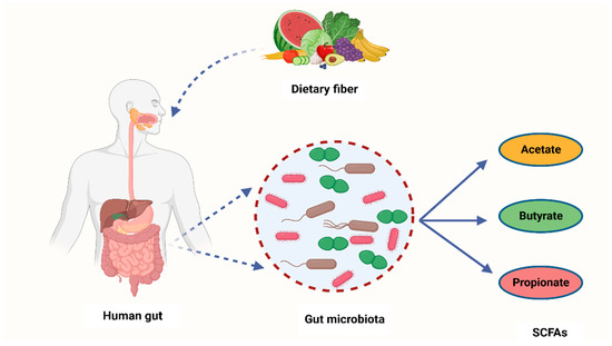A schematic diagram showing how bacteria from the human microbiome convert dietary fiber into three main SCFAs—acetate, butyrate, and propionate. Acetate is synthesized through conversion of pyruvate. This occurs in three ways: either through the reductive acetyl-CoA pathway, the Wood–Ljungdahl pathway, or directly through acetyl-CoA. On the other hand, butyrate is a product of acetyl-CoA reduction to butyryl CoA, which subsequently becomes converted into butyrate-by-butyrate kinase and transbutyrylase enzymes. Moreover, butyryl CoA may form butyrate through butyryl-CoA transferase-acetate. Lastly, propionate is formed through the succinate pathway. It can also be synthesized via the acrylate pathway from lactate (precursor) with hexoses and pentoses (simple sugars) acting as reaction substrates. Propionate can also be formed through the propanediol pathway whereby rhamnose and fucose (deoxyhexoses) function as substrates. SCFAs—short-chain fatty acids, Acetyl-CoA—acetyl coenzyme A. Created with BioRender.com (Accessed on 4 July 2023).