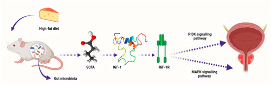 A schematic diagram showing how microbiota-derived SCFAs induced PCa carcinogenesis by activating the PI3K and MAPK signaling pathways through IGF1 and its receptor IGF-1R in Pten knockout PCa mice. Composition of the gut microbiota is influenced by diet content, e.g., high-fat diet. SCFAs—short-chain fatty acids, IGF-1—insulin-like growth factor-1, IGF-1R—insulin-like growth factor-1 receptor, PI3K—phosphatidylinositol-3 kinase, MAPK—mitogen-activated protein kinase. Created with BioRender.com (Accessed on 31 July 2023).