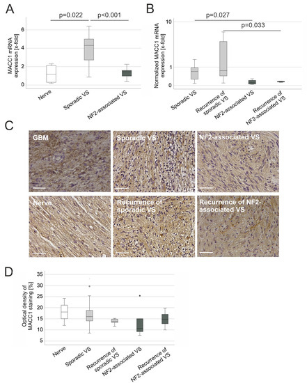 Immunohistochemistry was performed to confirm MACC1 expression at the protein level (Figure 1C). Although MACC1 protein expression was detected in all analyzed samples, there was no significant difference in the protein expression level between the different VS entities or normal vestibular nerve detectable (Figure 1D).