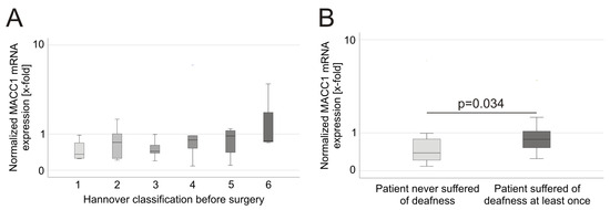 Remarkably, a closer look at the hearing impairment of patients with sporadic VS, as determined by the Hannover classification of audiometric results [32,33], revealed a tendency of increased MACC1 mRNA expression in the tumors of patients with a score of H6 compared to all other scores (Figure 2A). This score refers to pure tone audiometry (PTA) of >100 dB and a speech discrimination score (SDS) of 0% [32,33]. Therefore, it was analyzed whether MACC1 mRNA expression might be related with deafness in sporadic VS patients during their clinical course before initial surgery. Indeed, MACC1 expression was 1.7-fold higher in the subgroup of patients with sporadic VS suffering from deafness at least once pre-operatively, compared to patients who never suffered from deafness (p = 0.034) (Figure 2B).