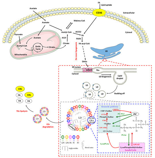- Krahmer, N.; Guo, Y.; Wilfling, F.; Hilger, M.; Lingrell, S.; Heger, K.; Newman, H.W.; Schmidt-Supprian, M.; Vance, D.E.; Mann, M.; et al. Phosphatidylcholine synthesis for lipid droplet expansion is mediated by localized activation of CTP:phosphocholine cytidylyltransferase. Cell Metab. 2011, 14, 504–515. [Google Scholar] [CrossRef] [PubMed]