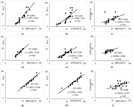 Figure 3. Strong positive correlations among ABC transporters and Bcl-2 expression (%) in DLBCL. The correlations among Bcl-2, MRP1/ABCC1, or BCRP expression (%). (ac) Remission; (df) Relapsed; (gi) Refractory DLBCL. Abbreviations: ABC—adenosine triphosphate binding cassette; DLBCL—diffuse large B-cell lymphoma.