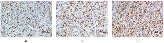 Figure 4. Representative examples of immunohistochemical staining for survivin in DLBCL (×200 magnification). (a) Remission, low IRS; (b) Relapsed, high IRS (≥ 4.5); (c) Refractory, high IRS (≥ 4.5). Abbreviations: DLBCL—diffuse large B-cell lymphoma; IRS—immunoreactive score.