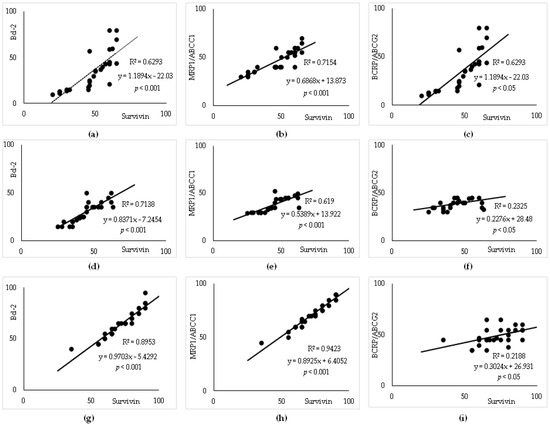 Figure 5. Significant correlations between survivin, ABC transporters and Bcl-2 expression (%) in DLBCL. (ac) Remission; (df) Relapsed; (gi) Refractory DLBCL. Abbreviations: ABC—adenosine triphosphate binding cassette; DLBCL—diffuse large B-cell lymphoma.
